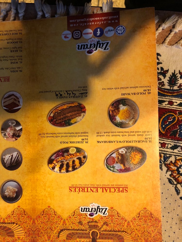 Although vegetarian options are limited, the café offers a casual dining experience with convenient amenities like delivery, takeout, and outdoor seating. Whether you're stopping by for lunch or dinner, Zaferan Café promises a comforting culinary journey that is sure to satisfy.